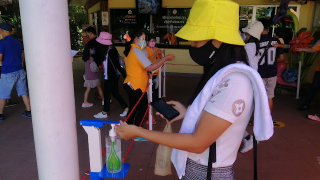 การเตรียมเจลล้างมือทำความสะอาดวางไว้จุดต่าง ๆ รอบสวนเสือศรีราชา การเว้นระยะห่าง