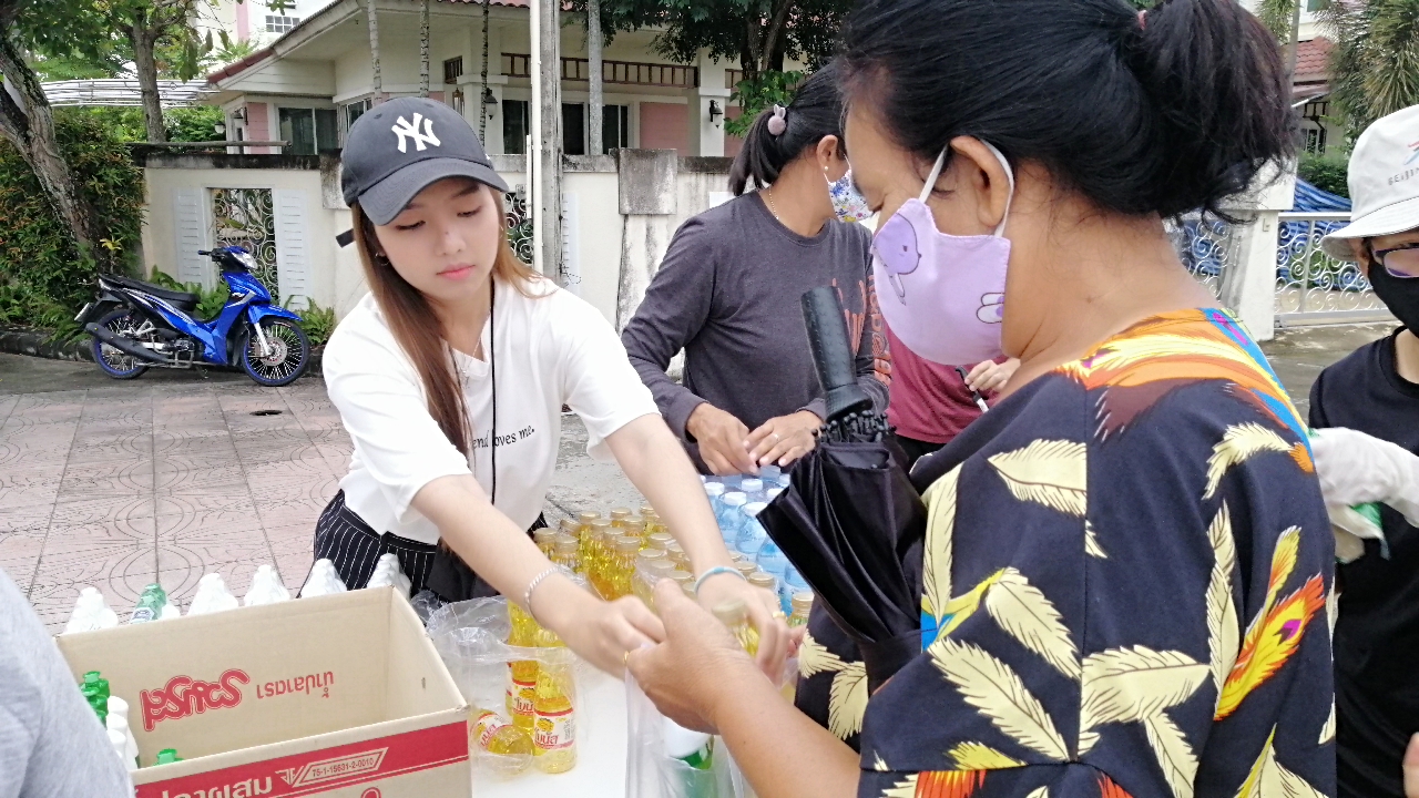 นำข้าวสารอาหารแห้งมาแจกจ่ายให้แก่ชาวบ้าน ในตำบลหนองขาม จังหวัดชลบุรี เพื่อลดภาระค่าใช้จ่ายให้แก่คนในชุมชนในช่วงสถานการณ์โควิด