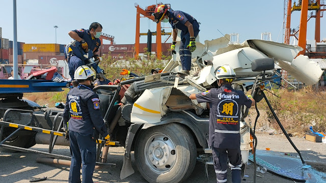 เมื่อเวลาประมาณ 14.00 น.วันนี้ ( 26 ก.พ. ) ศูนย์วิทยุกู้ภัยสว่างประทีปธรรมสถานศรีราชา จ.ชลบุรี ได้รับแจ้งอุบัติเหตุรถเทรลเลอร์ถูกตู้สินค้าที่บรรทุกมาทับ มีผู้ติดอยู่ในรถเทรลเลอร์ 2 ราย เหตุเกิดที่บริเวณ ท่าเรือ B 5 ภายในท่าเรือแหลมฉบัง ตำบลทุ่งสุขลา อำเภอศรีราชา จังหวัดชลบุรี จึงประสานรถอุปกรณ์ตัดถ่างมูลนิธิสว่างประทีปธรรมสถานศรีราชา พร้อมด้วย ทีมพยาบาลกู้ชีพวิภาราม และ ร.ต.อ.จีระศักดิ์ ว่องไว ร้อยเวรสอบสวน สภ.แหลมฉบัง เข้าร่วมตรวจสอบ