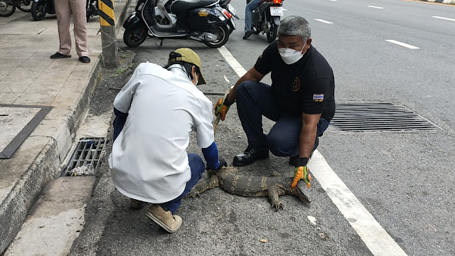 ตัวเงินตัวทองขนาดใหญ่เข้ามาติดอยู่ในห้องเครื่องของรถยนต์ ที่บริเวณริมถนนสุขุมวิท